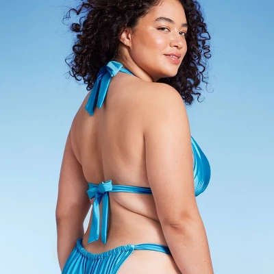 Triangle halter bikini top from Wild Fable™ in a solid hue. Made from soft fabric with spandex for stretchy comfort in and out of the water. Front knot details add a chic touch. Removable cups offer customizable coverage. Back and behind-neck ties provide a stay-put fit.